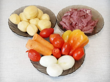 Как сделать индейку в горшочках с картошкой? Подготовьте продукты. Филе подойдет от любой части птицы, у меня грудка, с ней блюдо получается диетическим. С филе бедра — более сочным и жирным. Кроме картошки и лука вы можете взять любые овощи. У меня это морковь, болгарский перец и кабачок. Все овощи помойте и обсушите. Данное количество продуктов рассчитано на 4 небольших горшочка.