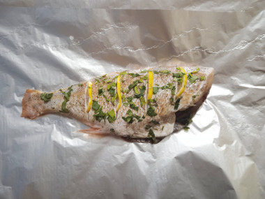 Захотелось приготовить морского окуня и нашла простой рецепт запекания в фольге в духовке. У меня было 4 рыбки. Я решила каждую завернуть в фольгу, удобно на порцию, и делала не с лимоном, не очень люблю, а с луком. Посолила с 2 сторон, приправу добавила, а сверху лук положила. Получилось очень вкусно. Рыба получилась нежная, прям тает во рту, лук с рыбой дали сок, получился такой соус, с которым рыбка ещё вкусней. Спасибо за идею приготовления в фольге.