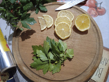 Противень застелите фольгой. Выложите рыбу на фольгу, сделайте на каждой тушке по 4 поперечных надреза сверху. В каждый вставьте по ломтику лимона. Петрушку помойте и обсушите, мелко порубите ножом, посыпьте зеленью рыбу сверху и в брюшко. Фольгу хорошо заверните, закрепите плотно края. Зелень можете взять любую по вкусу. С выбором формы для запекания и фольги вам помогут статьи под шагами.