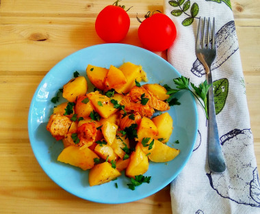 Картошка с мясом в духовке очень вкусное блюдо, которое отлично подходит для семейного ужина. А если в качестве мяса использовать индейку, так еще полезное диетическое блюдо. У нас даже маленькая дочка уплетала картошку и индейку по этому рецепту за обе щеки, что меня очень радует) Базилик и чеснок дали отменный аромат и вкус. Карри и черный перец я не стала добавлять, чтобы не сильно остро было для ребенка. Приправы для курицы, чеснока и трав нам вполне хватило. Блюдо получилось невероятно вкусным и ароматным, отличное сочетание продуктов и приправ. Рекомендую всем к приготовлению!