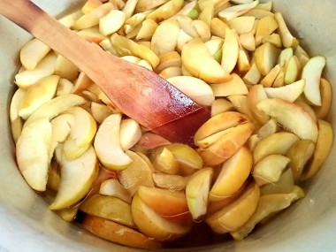 Полученным горячим сиропом залейте яблоки. Дайте им настояться в сиропе 30 минут.