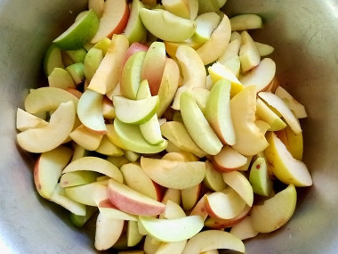Яблоки выбирайте твердых осенних сортов, в противном случае они будут развариваться и вы получите джем, а не варенье дольками. Каждая долька яблока в готовом варенье должна быть целой и не разваливаться. Яблоки вымойте, очистите. Удалите сердцевину и нарежьте тонкими дольками (пластинами). Взвесьте. У меня чистый вес 1000 грамм.