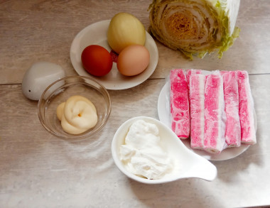 Как сделать салат из крабовых палочек с капустой, кукурузой и яйцом? Подготовьте необходимые ингредиенты. Куриные яйца стоит заранее отварить вкрутую, чтобы к моменту приготовления салата они успели остыть.