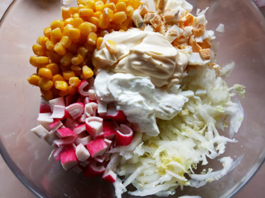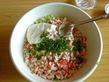 Крабовые палочки так же нарежьте мелким кубиком и отправьте к яйцам с капустой.