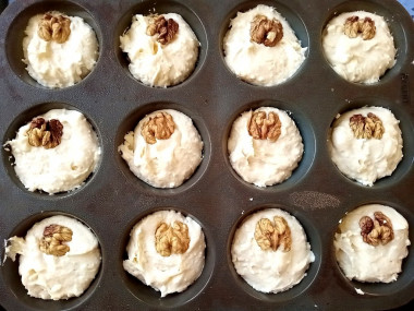 Все ингридиенты я замешивала миксером. Сливочное масло заранее достала из холодильника, чтобы оно стало мягким и хорошо взбилось. Яйца тоже достала одновременно с маслом, лучше, когда продукты одной температуры. Творог у меня был 9% влажный, отдельно его не измельчала. Нам нравятся вкрапления творога). Изюм мы не любим, поэтому не добавляла его. Зато на каждую заготовку выложила половинку грецкого ореха, с ним кексы тоже получились вкусными. Выпекала 40 минут до румяного цвета. Готовность проверила с помощью деревянной палочки.