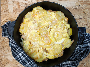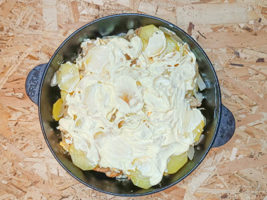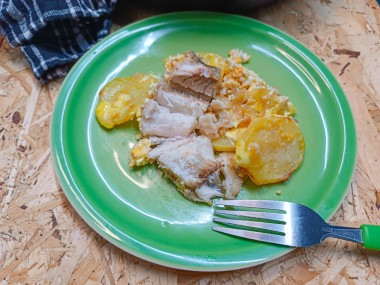 Поставить рыбу с картошкой в разогретую духовку на 15-20 минут или пока верхний слой не зарумяниться.