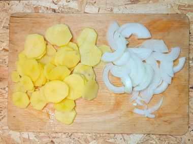 Овощи почистить, помыть и обсушить. Картофель нарезать тонкими кружочками. Лук порезать полукольцами.