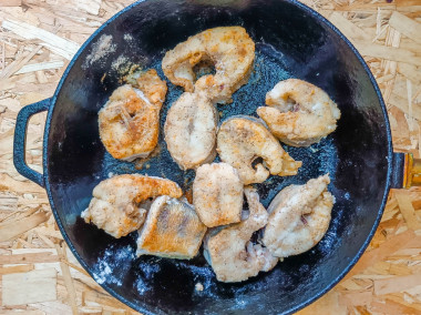 Рыбу почистить, помыть, обсушить и порезать на порционные кусочки толщиной 2-3 см. Можно купить готовые стейки в магазине. Кусочки посолить, поперчить и каждый со всех сторон хорошо обвалять в муке.