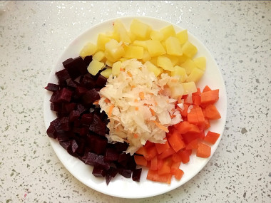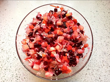 Смешать в большой миске все нарезанные овощи, положив туда готовую квашеную капусту.