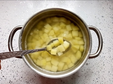 Картофель очистить, помыть и нарезать небольшими кубиками. Нарезанный картофель опустить в слегка подсоленную воду, прокипятить в течение 5 минут. Он должен быть готов, но ни в коем случае не развариться.