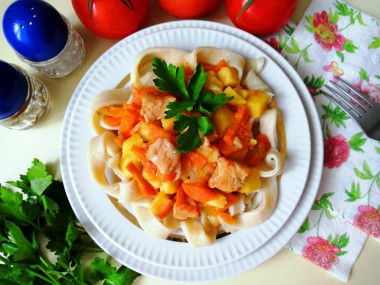 Для заправки лагмана обжарила на сковороде мясо, добавила морковь и лук, жарила до мягкости овощей. Посолила, добавила немного готовой приправы для мяса. Затем выложила нарезанную редьку (у меня был дайкон) и картошку, пассеровала минут 10. Залила все горячей водой, тушила под крышкой 25 минут. После этого добавила нарезанные помидоры, готовила под крышкой ещё 15 минут. Ароматы разносились по дому фантастические!
