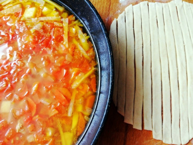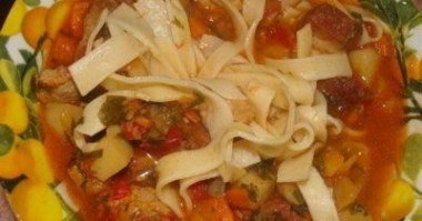 Тем временем раскатала тесто, нарезала лапшу шириной около 1 см. Отварила ее в подсоленной воде до готовности.