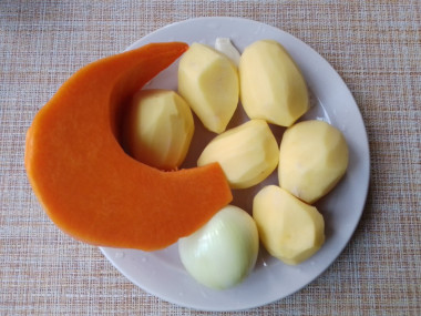 Очистите помытые овощи от кожуры: тыкву, картошку, репчатый лук.