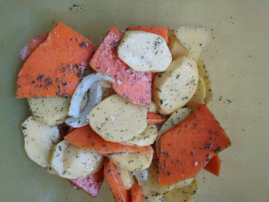 Нарежьте тыкву плоскими прямоугольниками, картошку - тонкими кружочками, лук - тонкими кольцами. Сложите все овощи в большую миску.