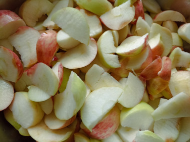 Яблоки хорошо помойте и откиньте на дуршлаг, чтобы с них стекла вода, или обсушите бумажными полотенцами. Кожицу, если она не повреждена, срезать не обязательно. Нарежьте яблоки дольками, удаляя сердцевину.