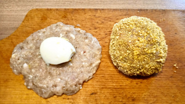 Закройте яйцо фаршем и сформируйте в виде большой котлеты. Обваляйте котлету в панировочных сухарях.