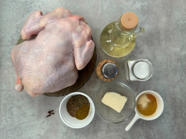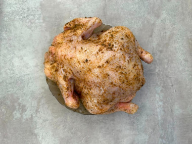 Курицу хорошо вымойте (в том числе и внутри). Удалите гузку (хвостик) и лишний жир. Тщательно натрите курицу маринадом снаружи и внутри. Для этого понадобится около трёх столовых ложек. Остальной маринад потребуется в дальнейшем при запекании. Курицу уберите в холодильник минимум на два часа для маринования.