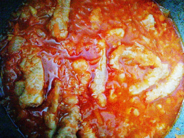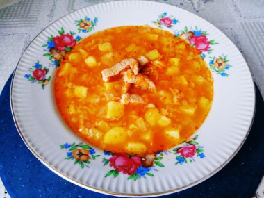 Положила в казан к зажарке кусочки свинины, лавровый лист, паприку, томатную пасту, перемешала и залила всё кипящей водой. Варила суп около часа, пока мясо не стало мягким. Потом добавила нарезанную кубиком картошку и варила суп ещё 25 минут. Когда он был практически готов, добавила немного соли.