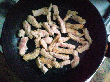 Я для своего супчика нарезала мясо на небольшие брусочки, посолила их, обваляла в муке и обжарила до золотистой корочки на сковороде.