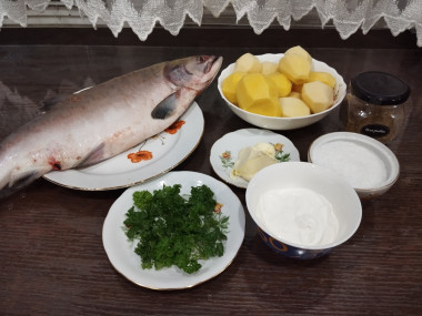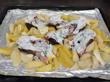 Рыбу очистила и порезала на стейки, выложила на противень. Посолила и посыпала специями для рыбы. Картофель порезала дольками и также выложила на противень между стойками рыбы. В сметану добавила измельченную зелень петрушки и перемешала. Выложила соус на рыбу.