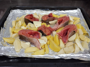 Картофель среднего размера почистить, помыть и порезать на средние кусочки - он должен успеть пропечься за то время, что готовиться рыба. Картошку посолить и выложить в форму для запекания между стейками рыбы. Сверху, чтобы картофель не был суховат, покрошить немного сливочного масла.