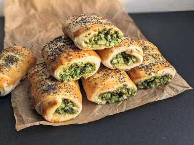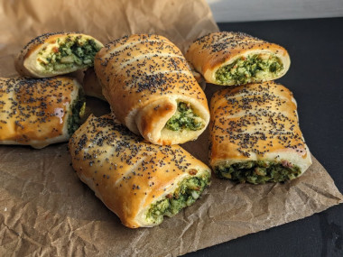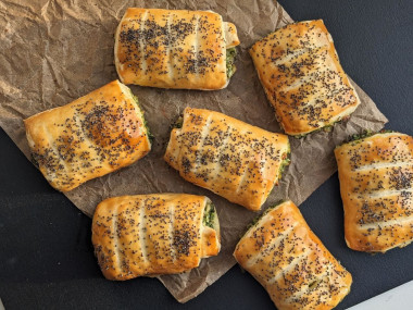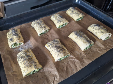 7. Равномерно распределяем начинку вдоль верхней стороны каждого листа теста, после чего сворачиваем аккуратно листы в рулет. Края смазываем взбитым яйцом и "приклеиваем" их к рулетам. Потом разрезаем рулеты на части.