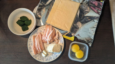 Вспомнила о кусочке слоёного теста, лежащем в морозилке, и вдохновилась испечь слойки с сыром и курицей. У меня были не все ингредиенты по рецепту, поэтому собирала начинку из "остатков". Сыр и курица у меня стали основой. А для лучшего вкуса я добавила к ним шпинат и зубчик чеснока. Всё измельчила - начинка готова!
