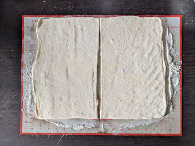 5. Успевшее растаять слоеное тесто выкладываем на рабочую поверхность, слегка подпыленную муку. Раскатываем тесто в большой пласт. Удобства ради его можно разрезать пополам.