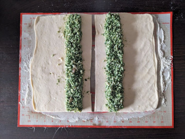 1) 1 пласт теста весом 250 г раскатала потоньше и разрезала напополам.