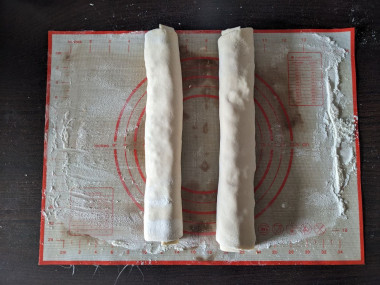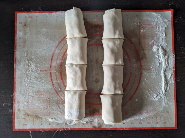 2) На каждую часть выложила полоску начинки и закатала её в рулетик. Из каждого рулетика получилось по 4 слойки. То есть всего 8 шт.