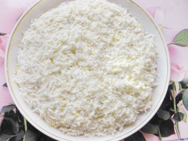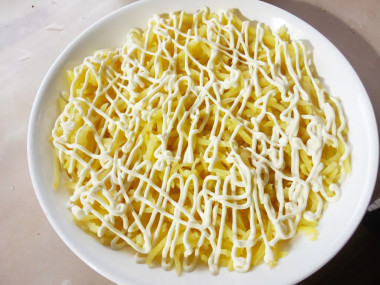 Точно так же следующим слоем натрите сыр и сделайте сеточку из остатков майонеза.