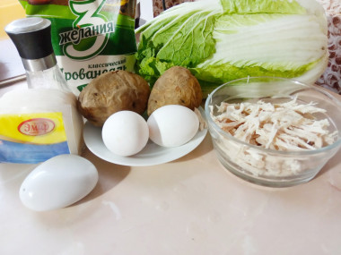 Как сделать салат Лебединый пух с пекинской капустой? Подготовьте все необходимые ингредиенты. Куриное филе предварительно отварите в подсоленной воде. Яйца отварите вкрутую. Картофель отварите до готовности в кожуре, затем охладите.