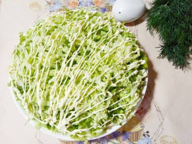 Посыпьте салат пекинской капустой. Салат поставьте на 1 час в холодильник для пропитки, после чего можете подавать к столу. Приятного аппетита!