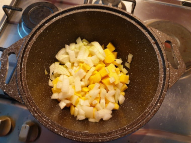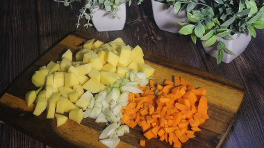 Мелким кубиком нарежьте очищенный картофель и другую часть репчатого лука. Положите овощи в бульон и сварите до полуготовности.