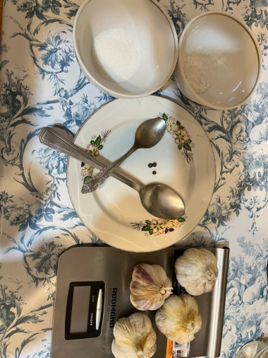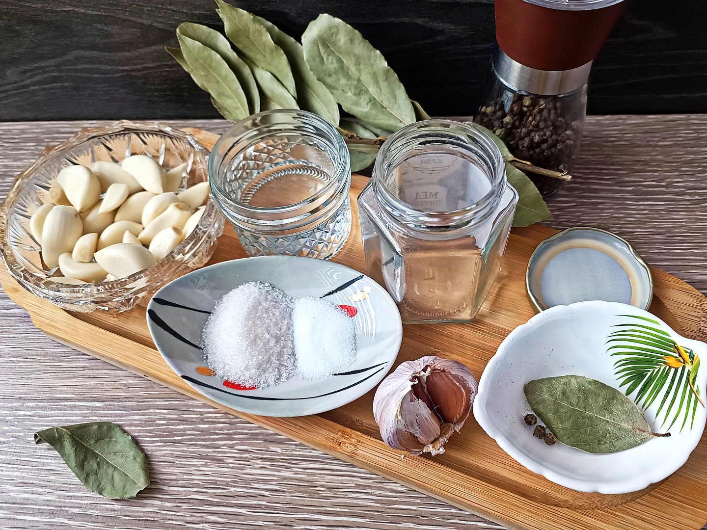 Очень давно хотела попробовать замариновать чеснок, но всё казалось, что это долго и сложно. Решила начать с этого рецепта, но чтобы не рисковать, приготовила маленькую порцию, примерно 100 грамм чеснока. Все ингредиенты из рецепта легко пересчитала с помощью калькулятора. Только лавровый лист и чёрный перец горошком добавила чуть побольше, так как у меня они были мелкие.