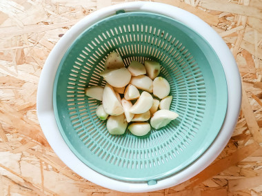 Чесночные головки разберите на зубчики и каждый очистите от шелухи. Переберите их - удалите все испорченные части. Обдайте очищенные зубчики кипятком. Это будет удобно сделать, сложив чеснок в дуршлаг и поставив его в раковину.