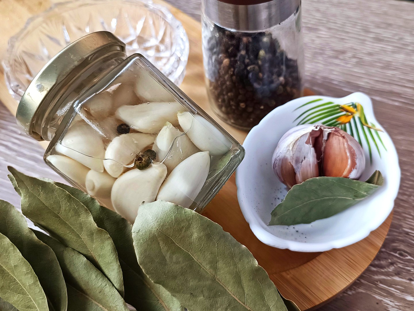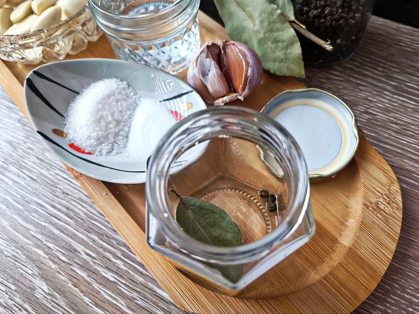 Банку, в которой будет мариноваться чеснок, тщательно промойте и обдайте кипятком. На донышко положите лавровый лист и горошинки душистого перца. Если заготавливаете чеснок на зиму, то банки и крышки нужно помыть с содой, простерилизовать любым удобным способом и обсушить на чистом полотенце. О том, как правильно стерилизовать банки и крышки и рассчитать их количество, читайте в статьях после рецепта.