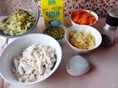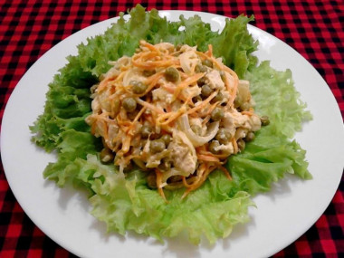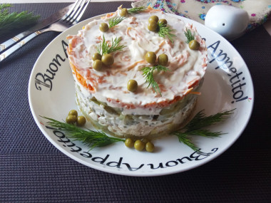 Я выложила слои салата в следующей последовательности: лук, курица, горошек, огурец и морковь. Приятного аппетита!