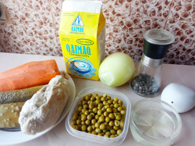 Как сделать салат с курицей и солеными огурцами? Подготовьте все необходимые ингредиенты. Как правило, для этого салата используют филе грудки, но можно брать и другую часть курицы. Вес в рецепте указан уже очищенных овощей. Растительное масло используйте без запаха. Очень большие огурцы лучше не брать, они более рыхлые, водянистые и с крупными семечками. Горошек советую взять проверенный, от его вкуса сильно зависит вкус всего салата.