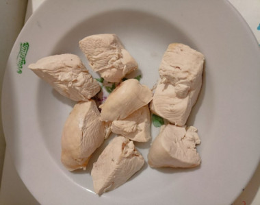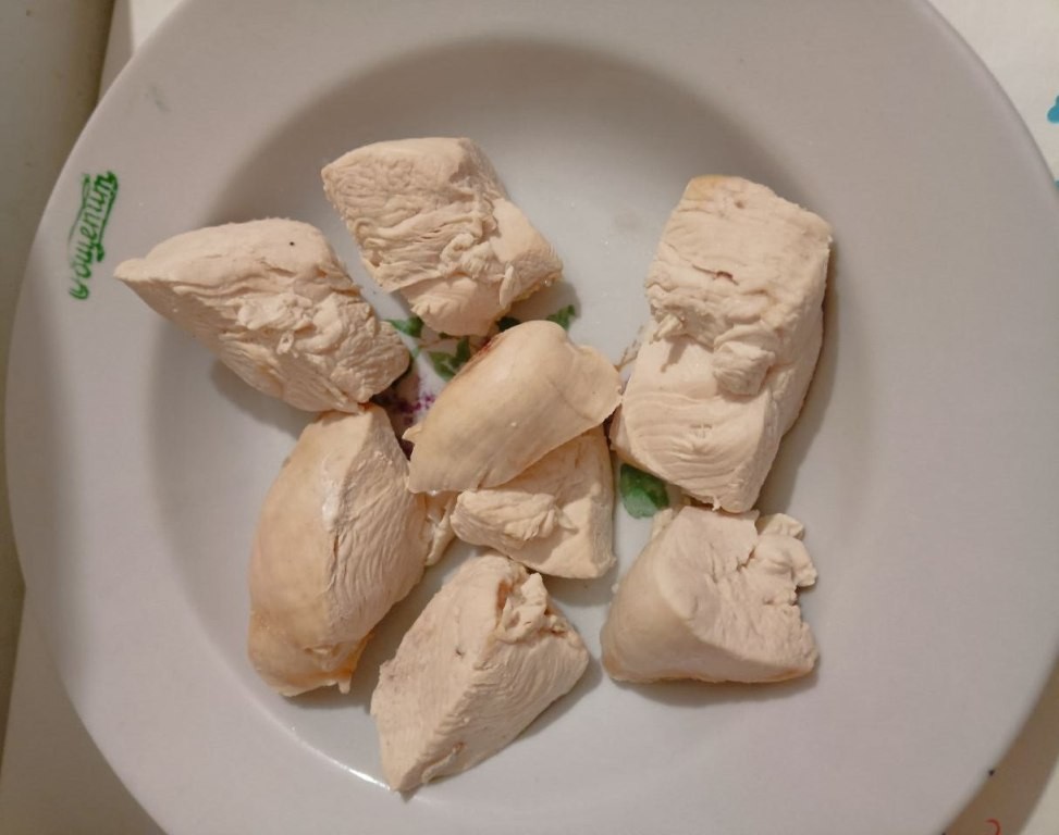 Я всегда стараюсь сократить время приготовления блюд, поэтому, что бы грудка сварилась быстрее, разрезала её на порционные кусочки, а вода уже грелась в мультиварке, время варки составило 10 минут.