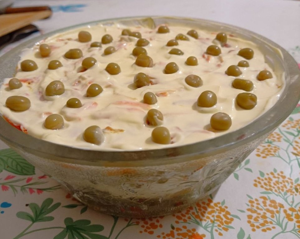 Слои сделала в таком же порядке, лук, курица, горошек, огурец и морковь, хотя полагаю, буду экспериментировать, меняя порядок.