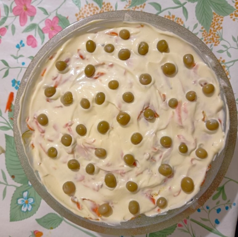 Горошка положила по весу больше, что бы не оставлять его в банке, хотя часть всё же пустили на украшения. Следующий раз на украшение думаю добавить оливки и маслины.