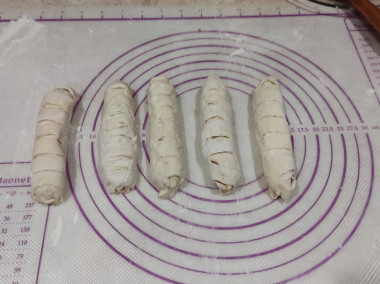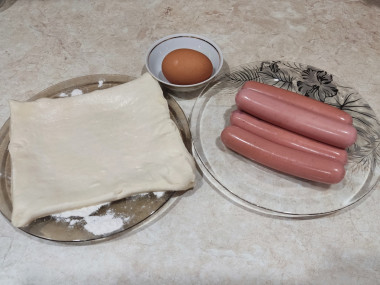 Тесто предварительно разморозила, сосиски очистила от пленки.