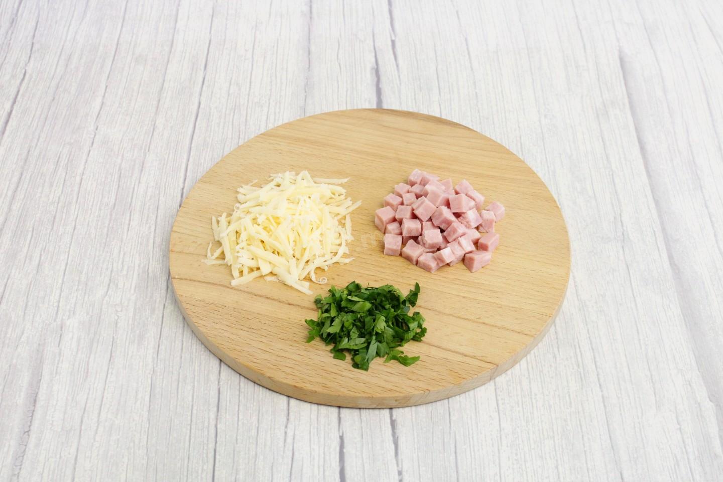 Ветчину нарежьте маленькими кубиками. Сыр натрите на крупной терке. Сыр подойдет любой: твердый, полутвердый, мягкий. Главное, чтобы был вкусным, без заменителей молочных жиров и хорошо плавился. Зелень помойте, обсушите, мелко нарежьте. Включите духовку разогреваться на 180 С.