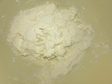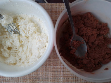 Ингредиенты тщательно перемешайте руками. Масса получается довольно густая. Если она получится слишком сухой, то влейте еще немного молока, слишком жидкой — добавьте печенья.