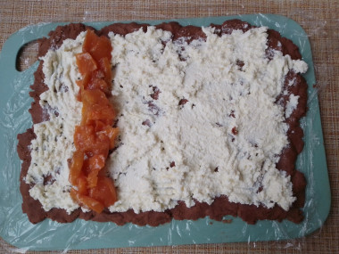 Постелила на разделочную доску пищевую плёнку и выложила на нее массу из печенья. Руками распределила по поверхности. Слой получился не толстый. Далее выложила творог и также распределила по всей поверхности. Для начинки взяла варенье из авйвы и выложила неширокой полоской. С помощью пищевой плёнки легко закрутила рулет и поставила его в холодильник.