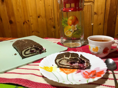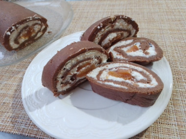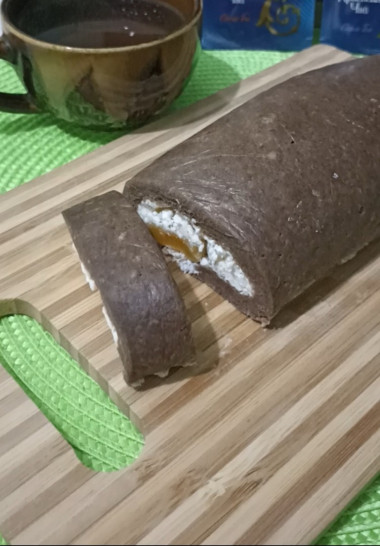 Замечательный рулет! Только молока потребовалось в два раза больше, а творога на сто грамм меньше и вместо варенья добавил курагу.
