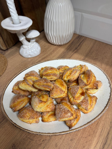 Сформируйте печенье — сначала посыпьте кружочек сахаром. Затем сложите его пополам, сахаром внутрь. Обмакните одну сторону в сахар, для этого удобнее будет насыпать его в пиалу или блюдце. Сложите заготовку еще раз, сахаром внутрь. И снова обмакните в сахар одной стороной. Сделайте таким образом печенье из всего теста. Обрезки собирайте снова в шар и раскатывайте также, как в начале.