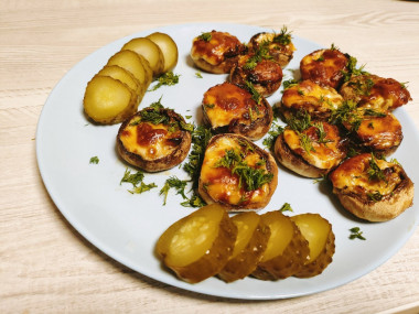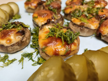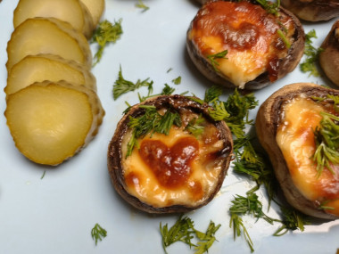 Отобрала несколько шампиньонов покрупнее, слегка помыла, обсушила и удалила ножки. Разложила кусочки сливочного масла. Сулугуни у меня был натертый на крупной тёрке и замороженный. Разложила его кучками по шляпкам. Вот и все, осталось запечь, мне понадобилось 25 минут.