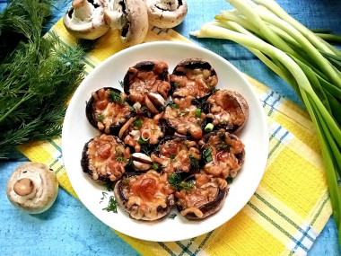 Шампиньоны я не мою, а стаскиваю верхний слой как кожуру. Так они не впитывают лишнюю влагу. Ножки тоже почистила, мелко обжарила, добавила маленькую головку лука (размером с крупную дольку чеснока) лук соль и специи. Пережарку смешала с майонезом. вышло совсем чуть чуть, буквально по пол ложечки в каждую шляпку. Сначала кусочек масла, потом пережарка и сверху кусочек сыра. на дно формы разложила несколько кусочков масла. Готовое блюдо посыпала укропом. Муж оценил. Сразу отметил необычный вкус. Так он еще не ел.